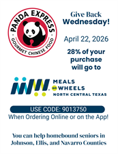 All day at Panda Express - use code 9013750 at checkout online or in the app to give 28% back to Meals on Wheels North Central Texas!