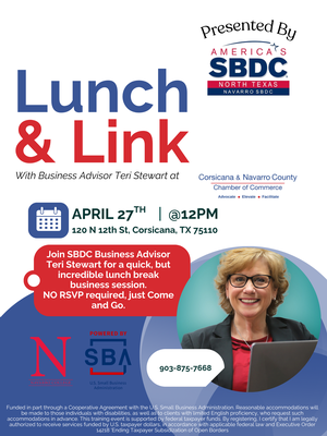 Please join us for a Lunch & Link with Business Advisor Teri Stewart presented by Navarro Small Business Development Center, the center is designed to provide small businesses with the practical assistance needed to start, grow and prosper your business.