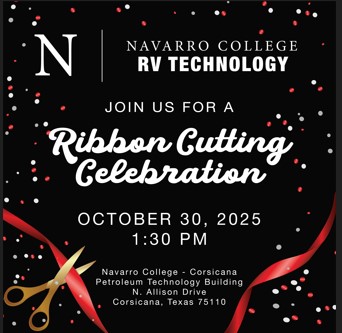 Come celebrate a Ribbon Cutting at the Petroleum Technology Building on the Navarro College Corsicana Campus on Thursday, October 30th @ 1:30 p.m. located on North Allison Drive. Hear about the new RV Technology program that is now available for the students & the community.